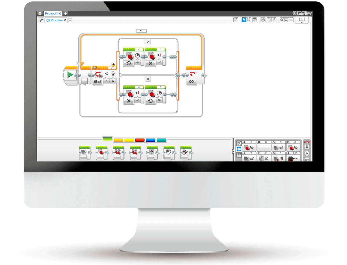 EV3ソフトウェア(EV3Lab)はLabVIEWベースのアイコン型のプログラミングソフトです。プログラミングブロックの使い方や作成のから実行までの手順を学べます。